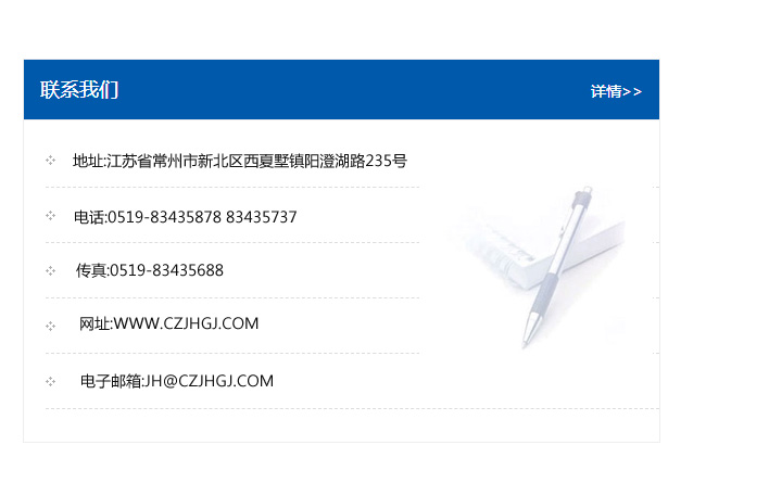 地址:常州市新北區友邦商務大廈1幢16、17層  電話:0519-85101652  傳真:0519-85112595  郵編:213022  網址:www.cz-jiayue_cn.zoom-tech.com  郵箱:xiajifengaa@163.com